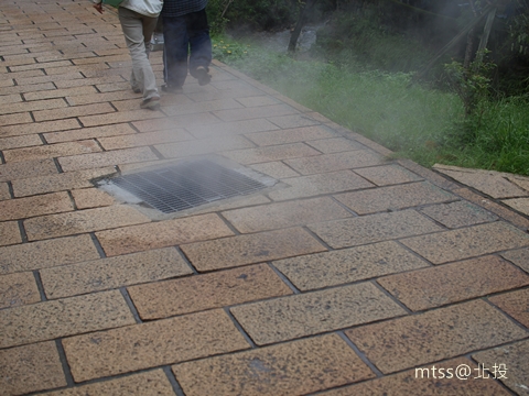 北投路邊的水孔蓋,冒著溫泉的熱氣,是北投特有的景象。如果穿短褲站在上頭,會有蒸氣室的感覺。