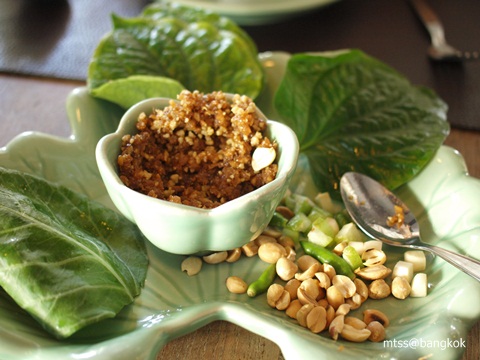 | ㄟ...不知道菜名,用葉子把所以其他東起包起來吃,甜甜辣辣的,好好吃啊~如果怕辣,只要家半顆辣椒就好,但如果不加辣椒,很奇怪喔...就沒那麼好吃了。 |
